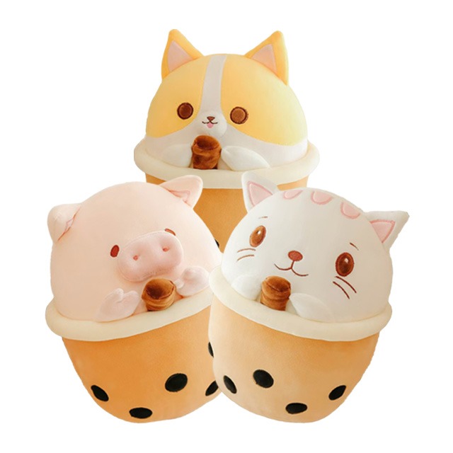 Superweiches Kuscheltier in Form eines im Bubbletea versunkenen Tieres (Hund Katze oder Schwein)