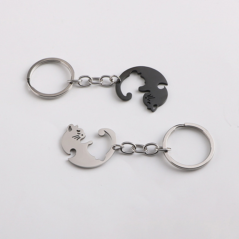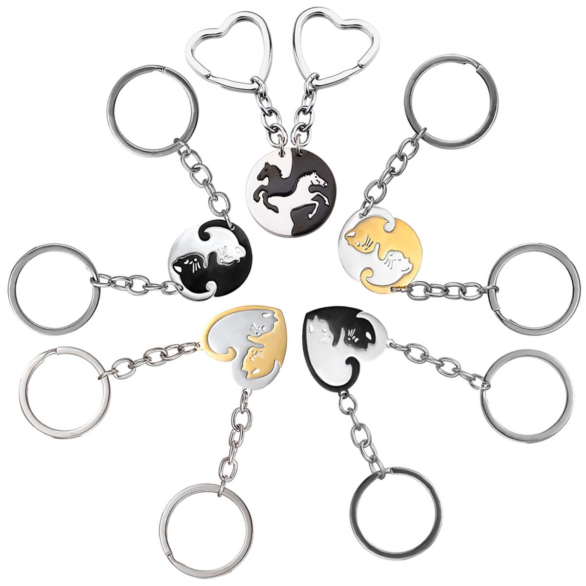 Ein Paar Schlüsselanhänger aus Metall bestehend aus zwei zusammenpassenden Katzen- oder Pferdanhänger in der Darstellung von YinYang.